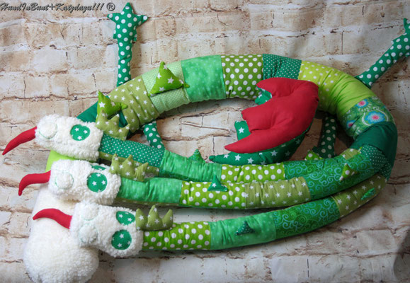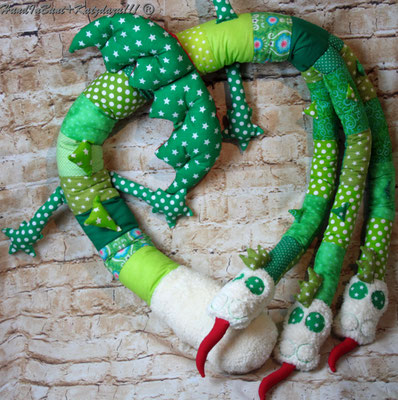 Genähtes Fabeltier mit drei Köpfen, verwendet wurden Bioplüsch und zertifizierte Ökostoffe aus Baumwolle. Ausführliche Beschreibung s.o.
