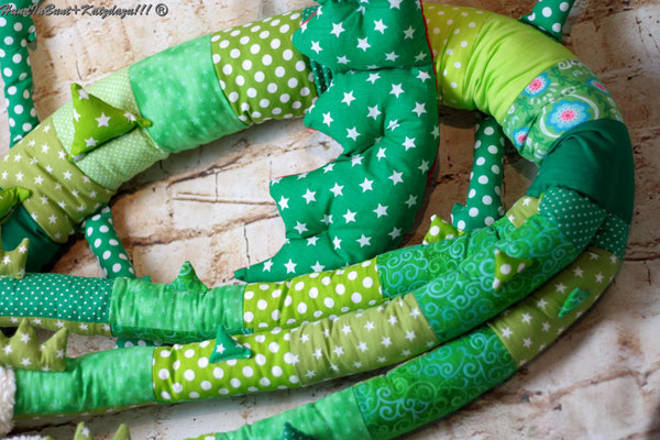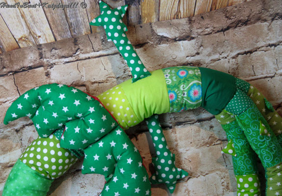 ♥ Schön aufeinander abgestimmte Farben in Patchworkoptik, weich und anschmiegsame Zacken, angenähte Füße, von Hand (mit abrisssicherem Faden) vernähte Köpfe, Plüschköpfe- und Schwanz ♥ und mit Sicherheit ein echter Hingucker!!